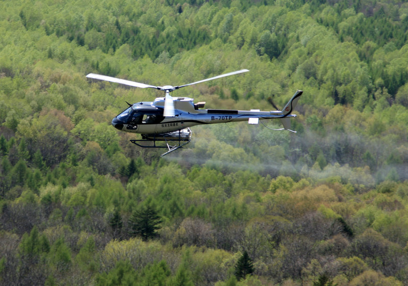 此次飛防是我局首次利用直升機(jī)噴藥的方式開(kāi)展防治松毛蟲作業(yè)。直升機(jī)載藥量為800公斤,飛機(jī)防治噴藥幅度50—70米,當(dāng)日實(shí)施“飛防”作業(yè)9架次,每個(gè)架次噴藥面積在150公頃以上,防治面積1200公頃。飛機(jī)噴施的藥劑為綠色無(wú)公害的植物源制劑——1.2%苦參煙堿乳油。通過(guò)實(shí)地監(jiān)測(cè)藥效,防治率達(dá)到了85%以上。當(dāng)飛機(jī)均勻地將藥物噴施在樹(shù)冠后,正在取食的松毛蟲紛紛中毒落地,防治效果非常明顯。