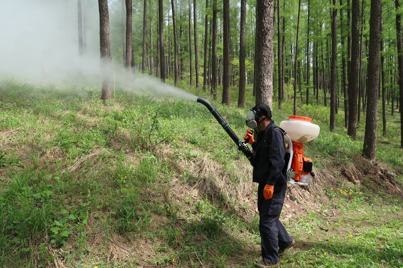 森防檢疫站工作人員在鬧枝林場165林班1小班的落葉松純林中,選取了11畝樣地進(jìn)行病毒防治試驗(yàn),其中防治面積9畝,對(duì)照面積2畝。防治試驗(yàn)過程中,工作人員在佩戴防毒面罩做好相關(guān)防護(hù)措施的前提下,按照試驗(yàn)預(yù)設(shè)的3個(gè)不同的病毒粉劑濃度梯度,利用背負(fù)式噴粉機(jī)將病毒粉劑噴施在落葉松林中,每個(gè)深度梯度重復(fù)處理3次。噴撒的病毒粉劑借助氣流和風(fēng)向擴(kuò)散到樹冠上,可使松毛蟲感染病毒致死。局森防檢疫站工作人員將在噴藥后第5天、第7天、第15天分別對(duì)防治試驗(yàn)樣地松毛蟲防治情況進(jìn)行調(diào)查,取得的試驗(yàn)數(shù)據(jù)將為利用和推廣桿狀病毒殺蟲劑防治落葉松毛蟲工作提供可靠依據(jù)。